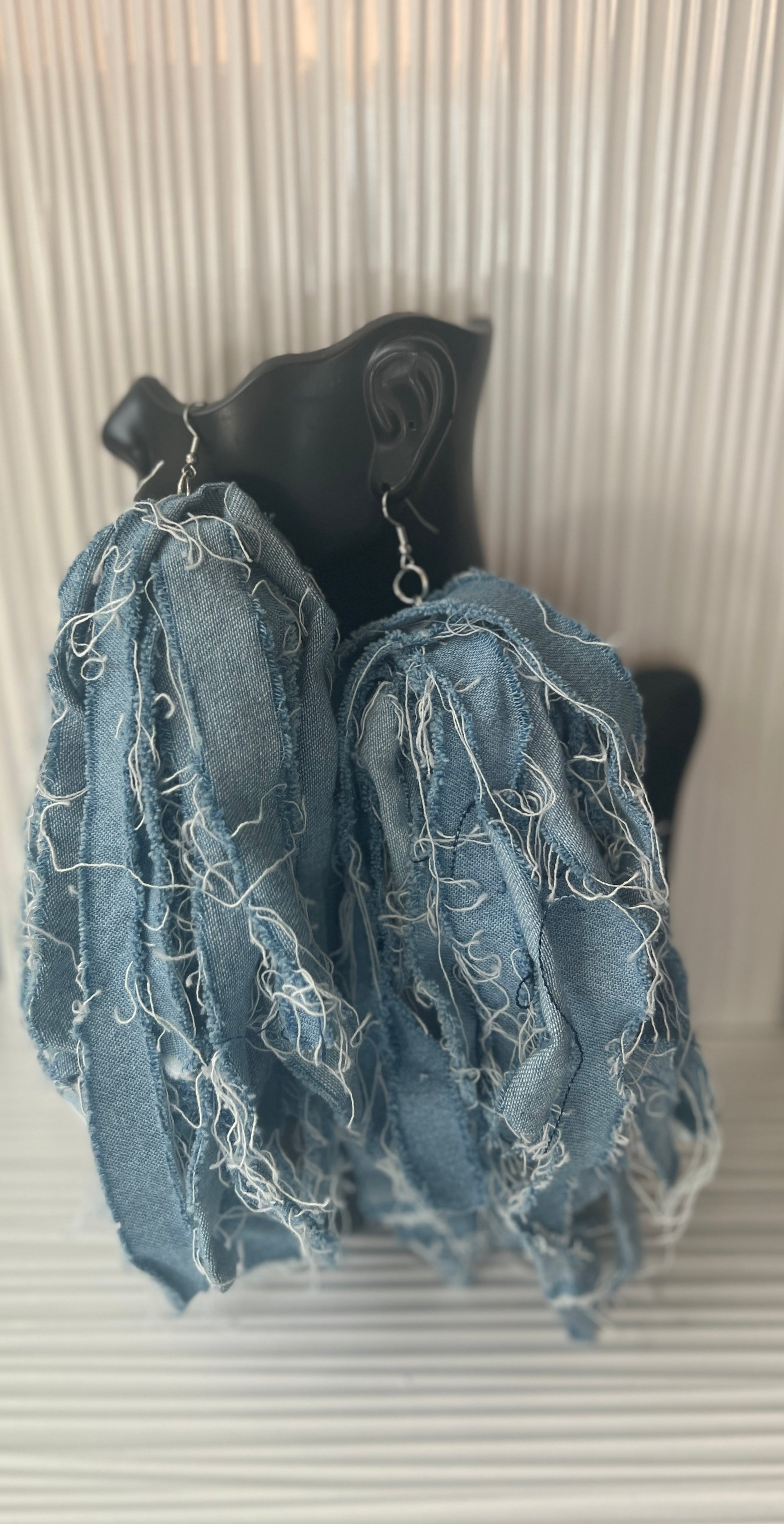 Light color fringe denim earrings. These earrings are super cute and fun. They are light to medium weight. Perfect pair to jazz up your outfit.