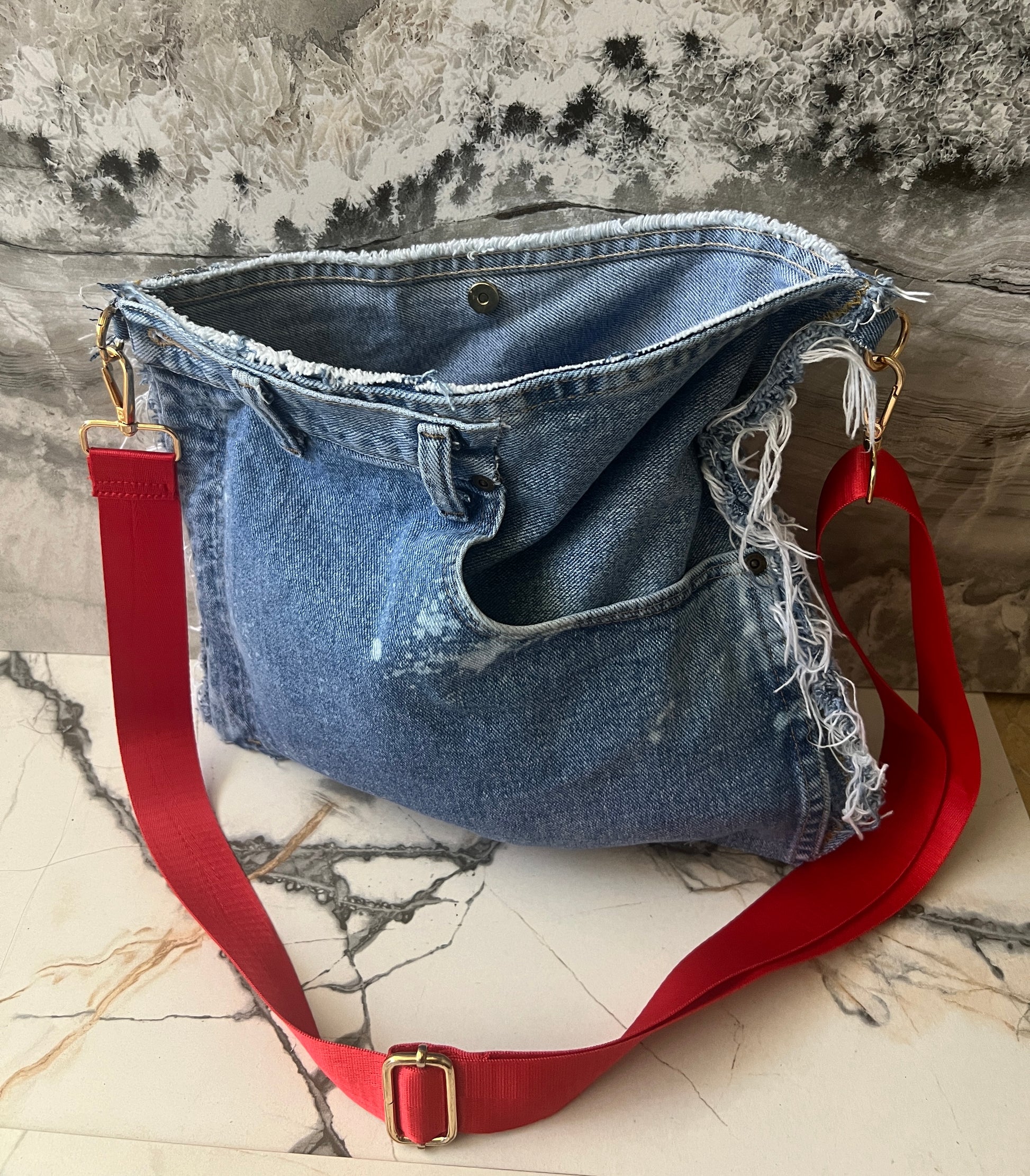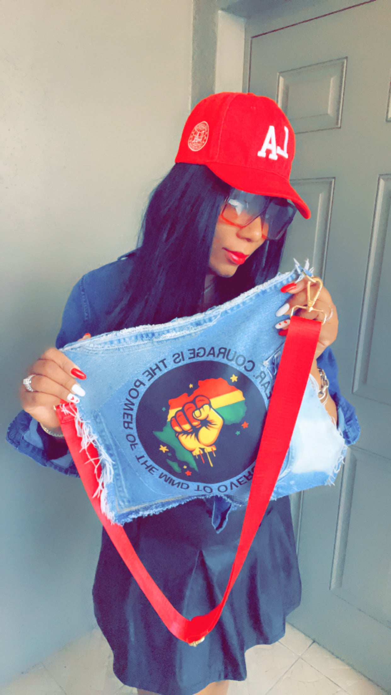 This Denim set is one of a kind. This handbag is an open face bag (Gold Closure) with red adjustable/removable strap. There’s a DTF screen print of a black fist with quote.
